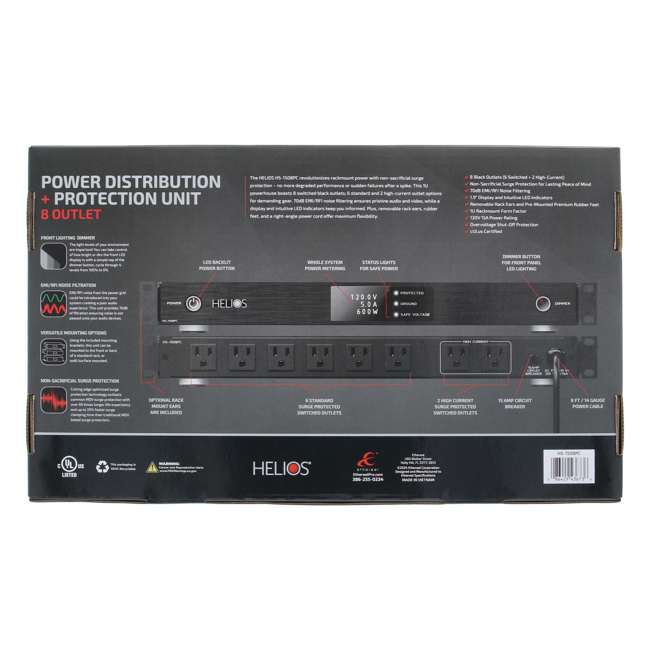 The HELIOS HS-1508PC revolutionizes rackmount power with non-sacrificial surge protection - no more degraded performance or sudden failures after a spike. This 1U powerhouse boasts 8 switched black outlets; 6 standard and 2 high-current outlet options for demanding gear. 70dB EMI/RFI noise filtering ensures pristine audio and video, while a display and intuitive LED indicators keep you informed. Plus, removable rack ears, rubber feet, and a right-angle power cord offer maximum flexibility.