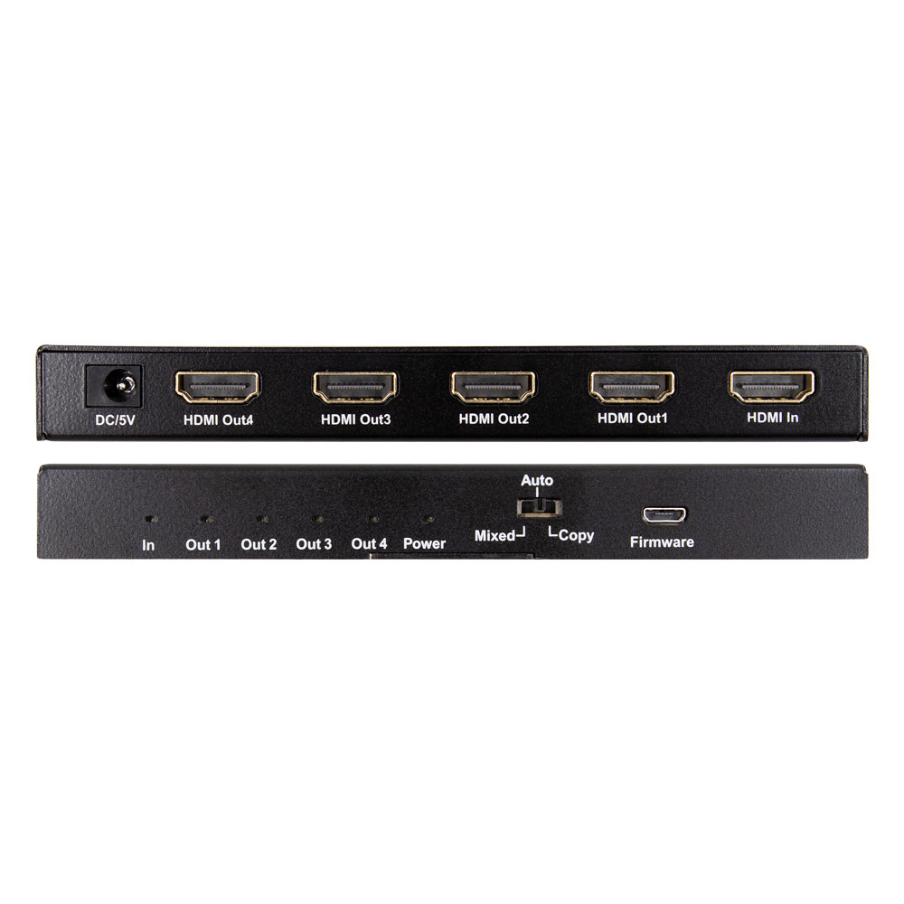 The CS-1X4HDMSPL5 with built-in scaling provides the ability to take any standard resolution and downscale it to match each of the connected displays (up to 4), simultaneously. For example, show 4K@60Hz content on a 4K display while also showing the same content scaled down on a 1080p display. Unlike traditional splitters, this built-in scaling allows legacy devices to work with newer higher resolution displays in the system, without automatically defaulting to the lowest resolution. Video quality on newer TVs is no longer sacrificed by having an older model in the mix.