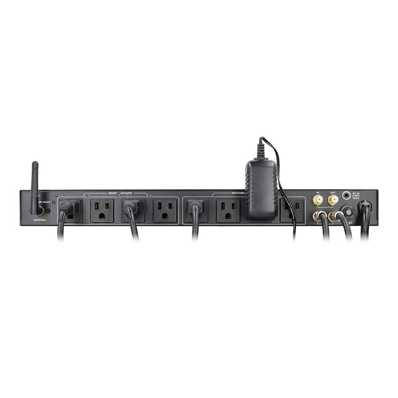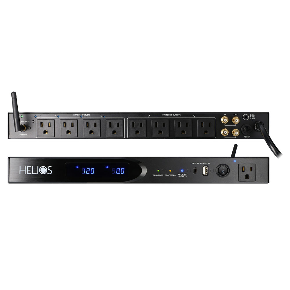 The Helios AS-P-603W power strip features a total of 9 AC outlets with 4 switched rear outlets, 1 easy-access always-on front outlet, 4 “smart” outlets controlled via the free mobile app, and 2 USB ports of USB A & USB C for portable device charging. This solution has overload protection and also protects equipment from a power surge of up to 2,160 joules. It has a 120volt/15A rating and 65dB EMI/RMI noise filtration to condition the power going to connected devices or lines. For cabling, it provides 2 pairs of coaxial connections and is rack-mountable. An LED display shows the voltage and a remote 12v DC trigger is included to control the switched outlets. This UL approved power strip has an 8ft cord, durable metal housing and comes with a 3-year limited warranty.