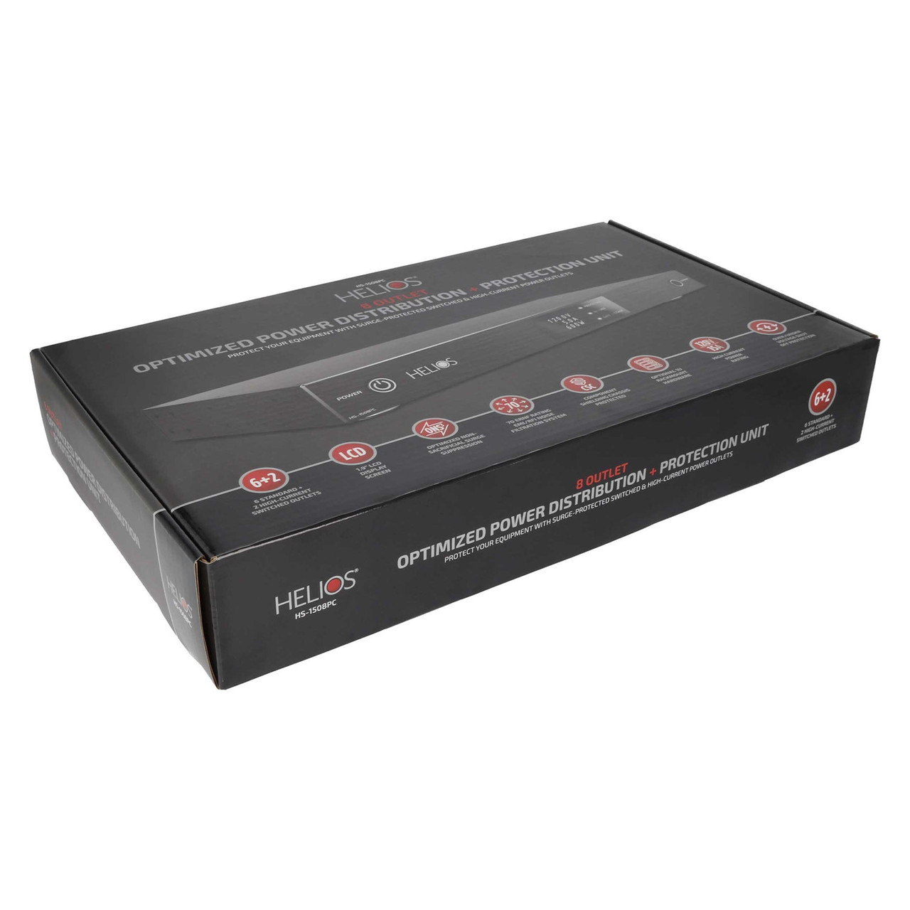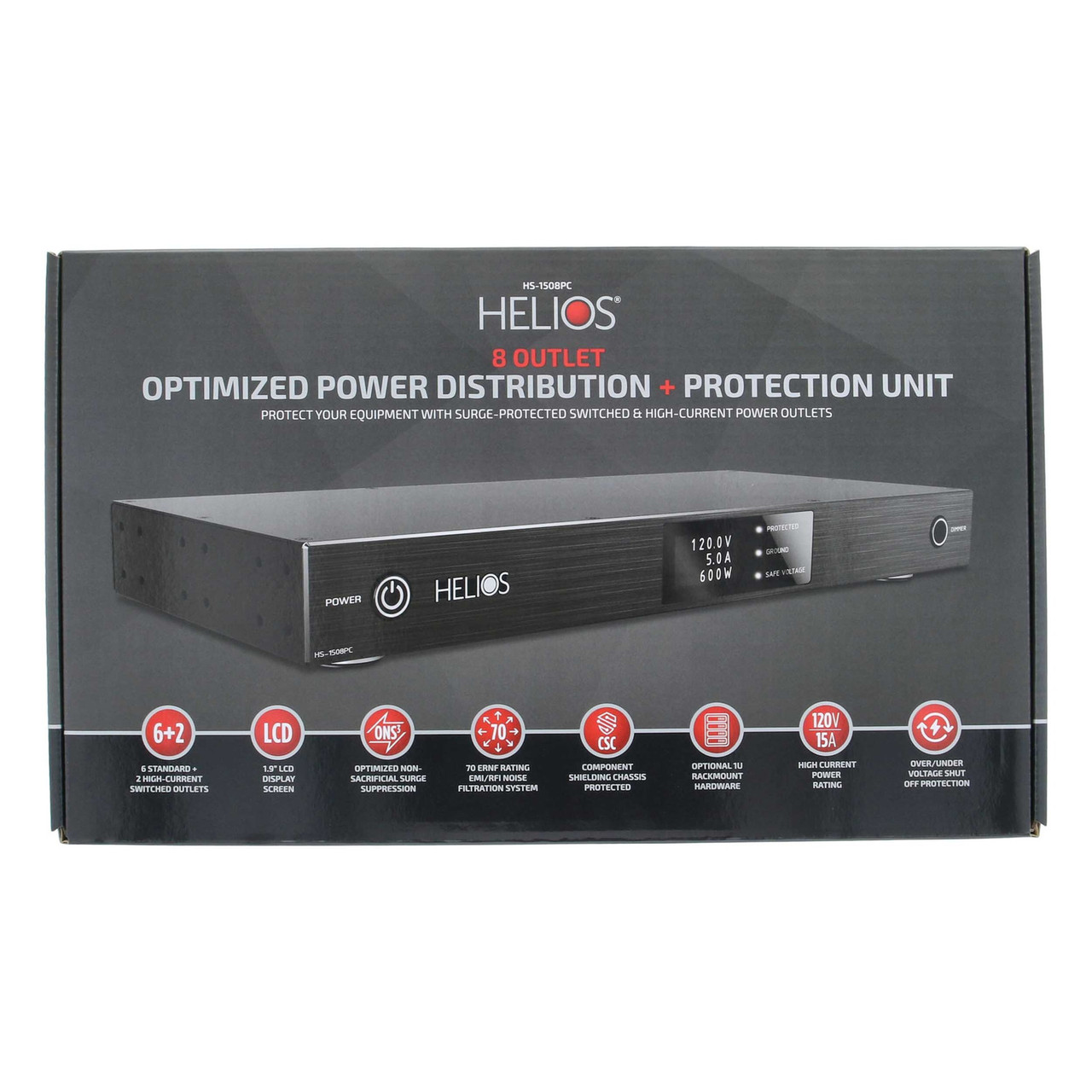 The HELIOS HS-1508PC revolutionizes rackmount power with non-sacrificial surge protection - no more degraded performance or sudden failures after a spike. This 1U powerhouse boasts 8 switched black outlets; 6 standard and 2 high-current outlet options for demanding gear. 70dB EMI/RFI noise filtering ensures pristine audio and video, while a display and intuitive LED indicators keep you informed. Plus, removable rack ears, rubber feet, and a right-angle power cord offer maximum flexibility.