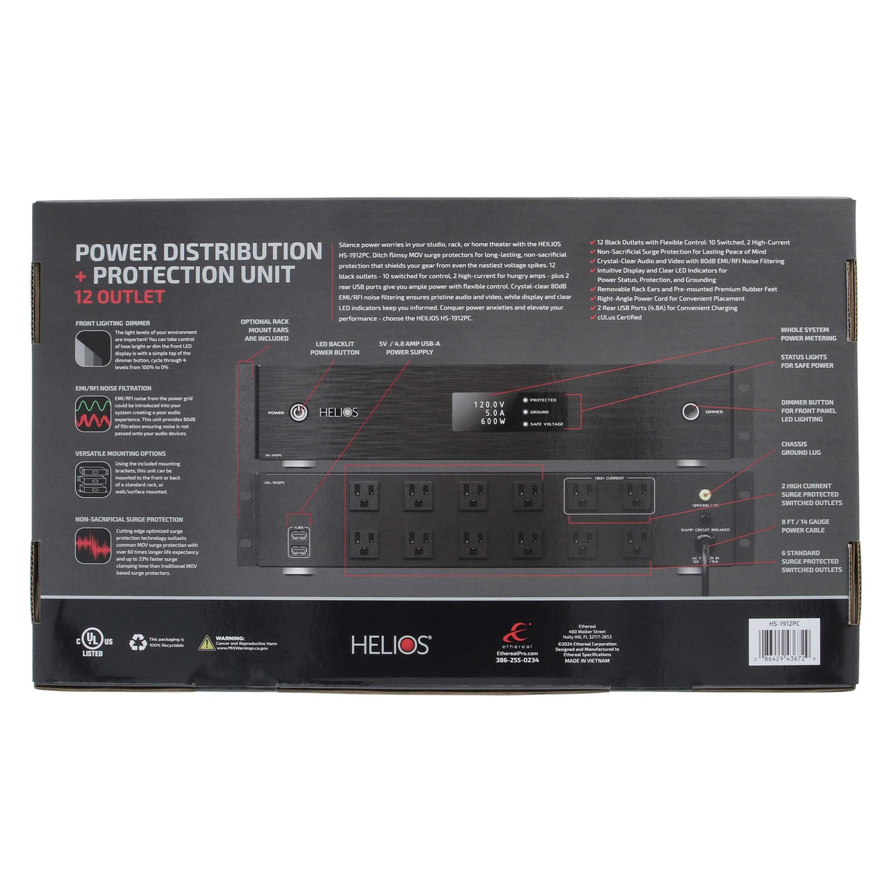 Silence power worries in your studio, rack, or home theater with the HEILIOS HS-1912PC. Ditch flimsy MOV surge protectors for long-lasting, non-sacrificial protection that shields your gear from even the nastiest voltage spikes. 12 black outlets -10 switched for control, 2 high-current for hungry amps - plus 2 rear USB ports give you ample power with flexible control. Crystal-clear 80dB EMI/RFI noise filtering ensures pristine audio and video, while display and clear LED indicators keep you informed. Conquer power anxieties and elevate your performance - choose the HELIOS HS-1912PC.